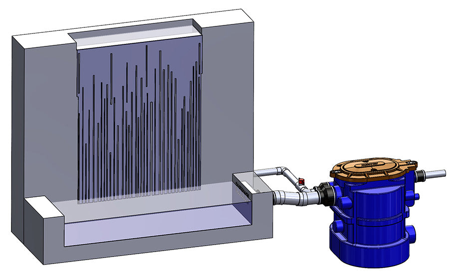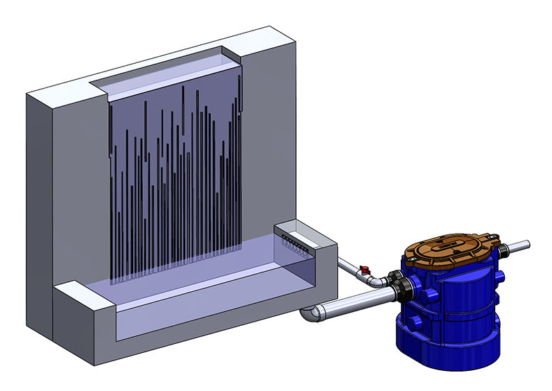 These kits feature a filter tank and skimmer that work with a waterwall where the bottom pool level is at the ground level and where the water flows through a metal skimmer into piping connecting to the Filtrific Filter Tank. The water then enters the tank, goes through the filters, and then gets pumped back up to the top of the waterwall.