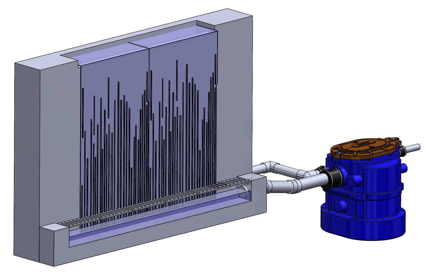 This Kit features a Filter tank located at the same level as the bottom pool. The water level in the bottom pool fluctuates up and down within the diameter of the pipe. The water then enters the tank, goes through the filters, and then gets pumped back up to the top of the waterwall.