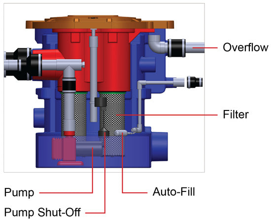 The Filtered Pump Vault houses the system filtration, pump, pumping components and reservoir in one compact unit.